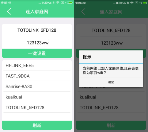将滴定加入家庭网后,只要手机接入家庭网即可对其进行配置。点击“家庭网”后,在下边 Wi-Fi 信号列表中选择家庭 Wi-Fi 信号名称,然后输入家庭 Wi-Fi密码点击“确认”。软件会自动退出,将手机接入家庭网路后,稍等几分钟再打开软件搜索设备。