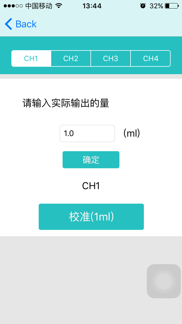 “校准”功能可校准通道精确度,进入校准页面后点击“校准”,该通道会输出约 1ml 的液量;请将实际输出量填入文本框中点击“确定”即可完成该通道校准。