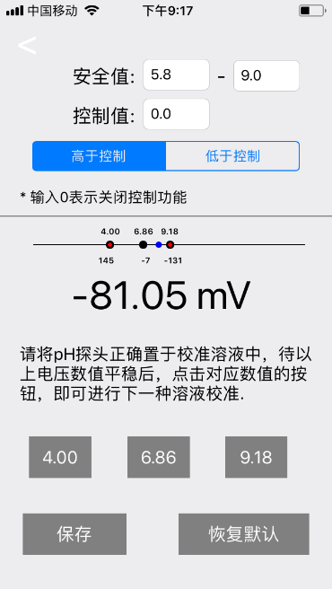 2) 安全值:显示设定的pH过低、过高报警pH值,超出此区间设备将发出报警声。